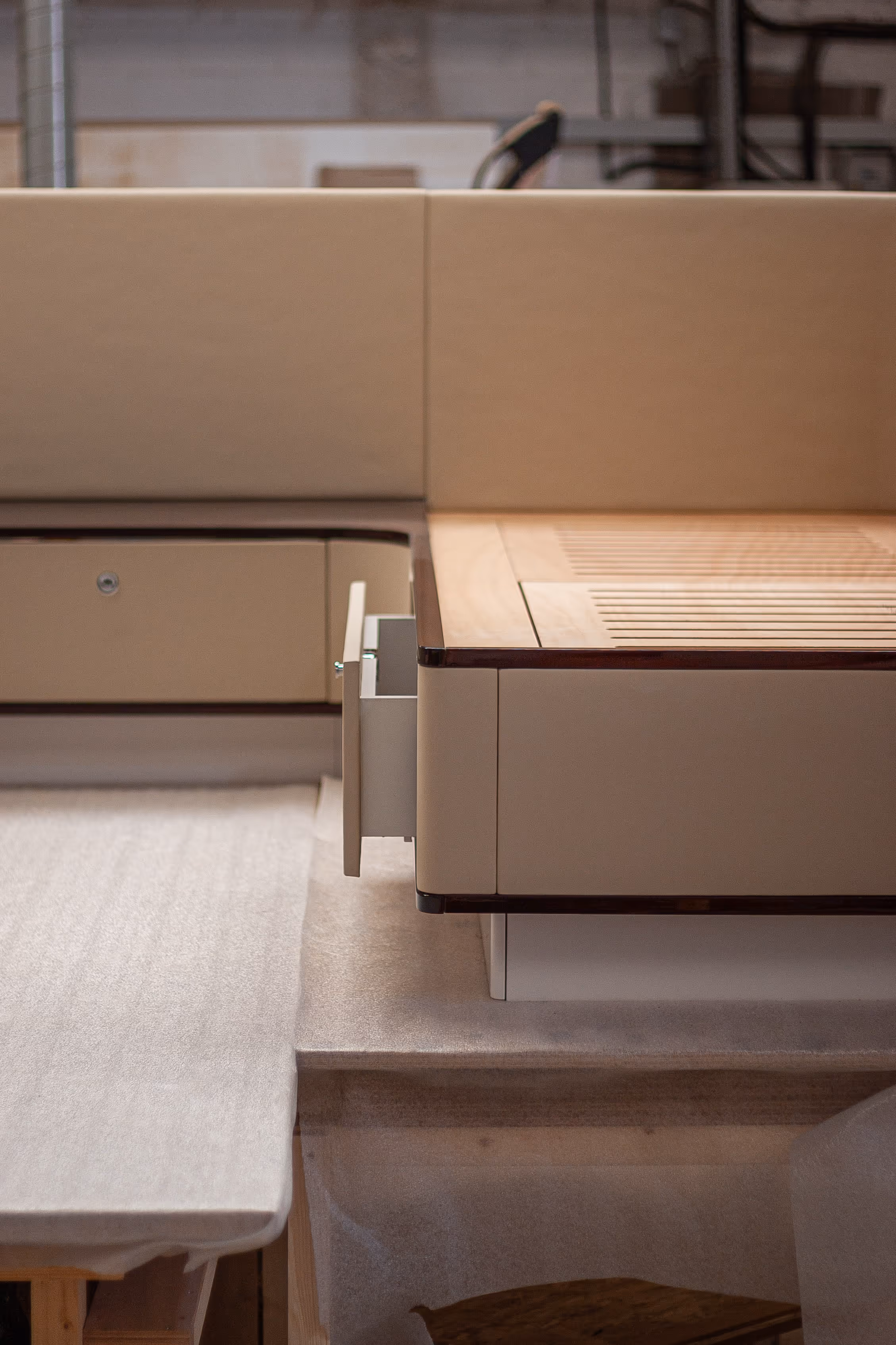We designed and built a new bed for a 26-metre motor yacht, with on-site work carried out in Cannes. The piece was crafted in premium leather with a high-gloss edge finish, precisely matching the original design language of the yacht. During production, we refined the structure and detailing to enhance both aesthetics and functionality — resulting in a piece that not only replicates but elevates the original concept. Every curve, seam, and joint was executed with precision, ensuring the final result integrates seamlessly into the interior’s existing style.